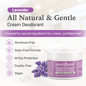 Have you been looking for a lavender cream deodorant that is All-Natural, Aluminum Free and formulated to provide tough, effective protection? Look no further! Our lavender cream all-natural deodorant is a great choice for those seeking natural solutions to controlling body odour. This all natural deodorant provides a calming scent that lasts all day. Each container of lavender cream deodorant provides approximately 2-3 months of daily protection. Now with Shea Butter for added smoothness!