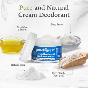 Tough, effective and long-lasting protection make this natural deodorant cream a great choice for everyone. If you have been looking for an unscented natural deodorant and want to feel good about your health, your search is over! Our unscented aluminum free cream deodorant keeps you smelling fresh all day. Each container of unscented cream natural deodorant provides about 2‑3 months of daily protection. Now with Shea Butter for added smoothness!