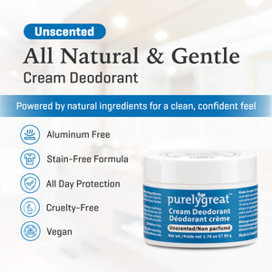 Tough, effective and long-lasting protection make this natural deodorant cream a great choice for everyone. If you have been looking for an unscented natural deodorant and want to feel good about your health, your search is over! Our unscented aluminum free cream deodorant keeps you smelling fresh all day. Each container of unscented cream natural deodorant provides about 2‑3 months of daily protection. Now with Shea Butter for added smoothness!
