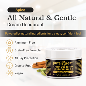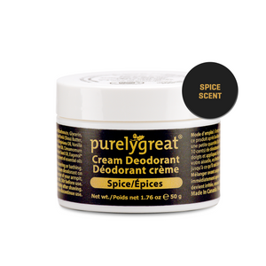 Tough, effective and long-lasting protection make this aluminum-free spice deodorant cream a great choice. If you have been looking for a natural deodorant and want to smell great and feel good about yourt health, your search is over! Our spice cream deodorant provides a healthy natural scent that lasts all day. If you love the scent of Clove, Cinnamon and Cardamom you'll love this truly exotic blend! Now with Shea Butter for added smoothness!